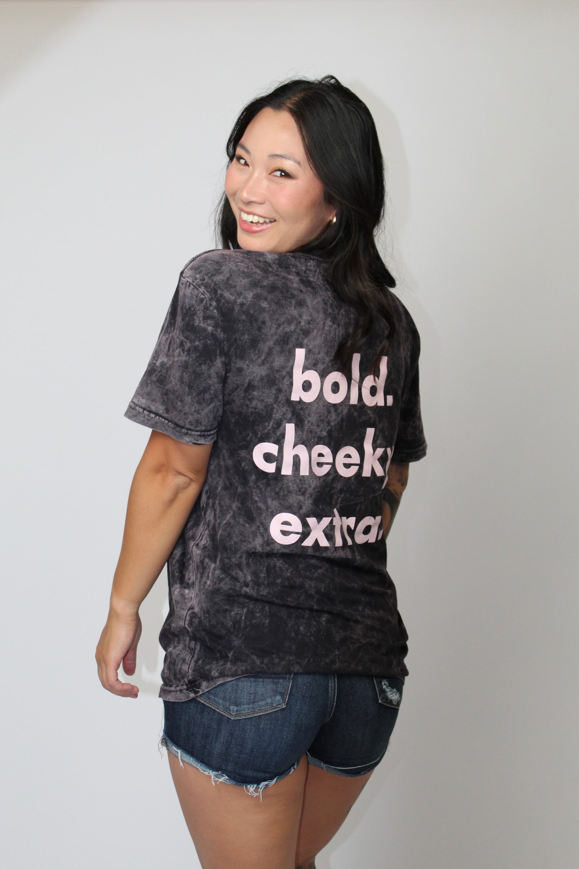 Finished in a cloud black vintage wash with light pink lettering, this shirt nails the effortless-cool look — soft in feel, loud in attitude.